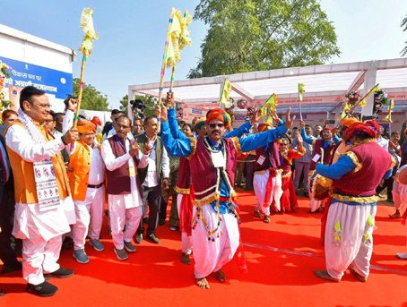 इसके पष्चात मुख्यमंत्री भजनलाल शर्मा श्री भोगीलाल पंड्या राजकीय महाविद्यालय मैदान पहुंचे, जहां उनका मंगल कलष और जनजाति नृत्य के ढोल-ढमाकों के साथ आदिवासी परंपरा के अनुसार स्वागत-अभिनंदन किया गया।