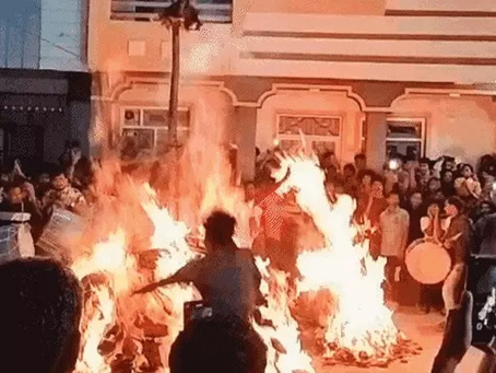 आग के बीच कूदे युवक, तलवारों से खेला गैर-नृत्य